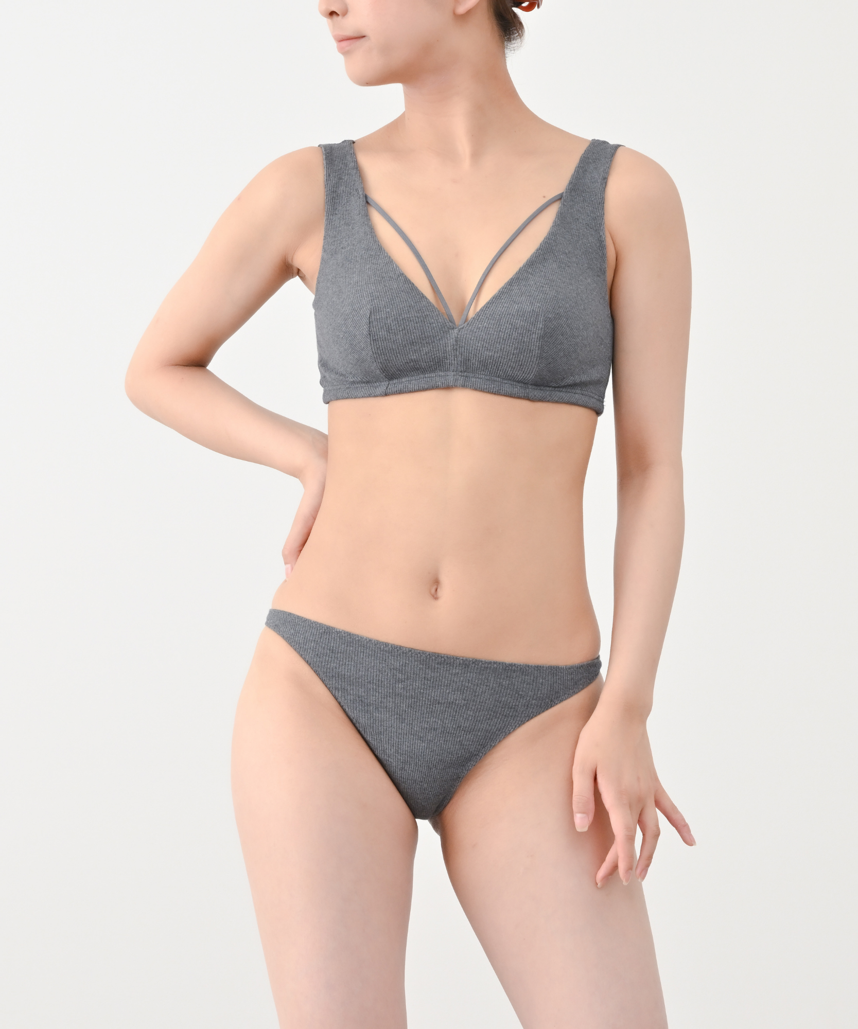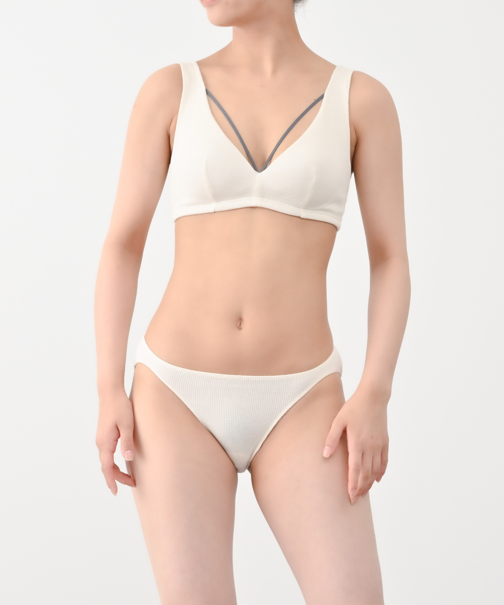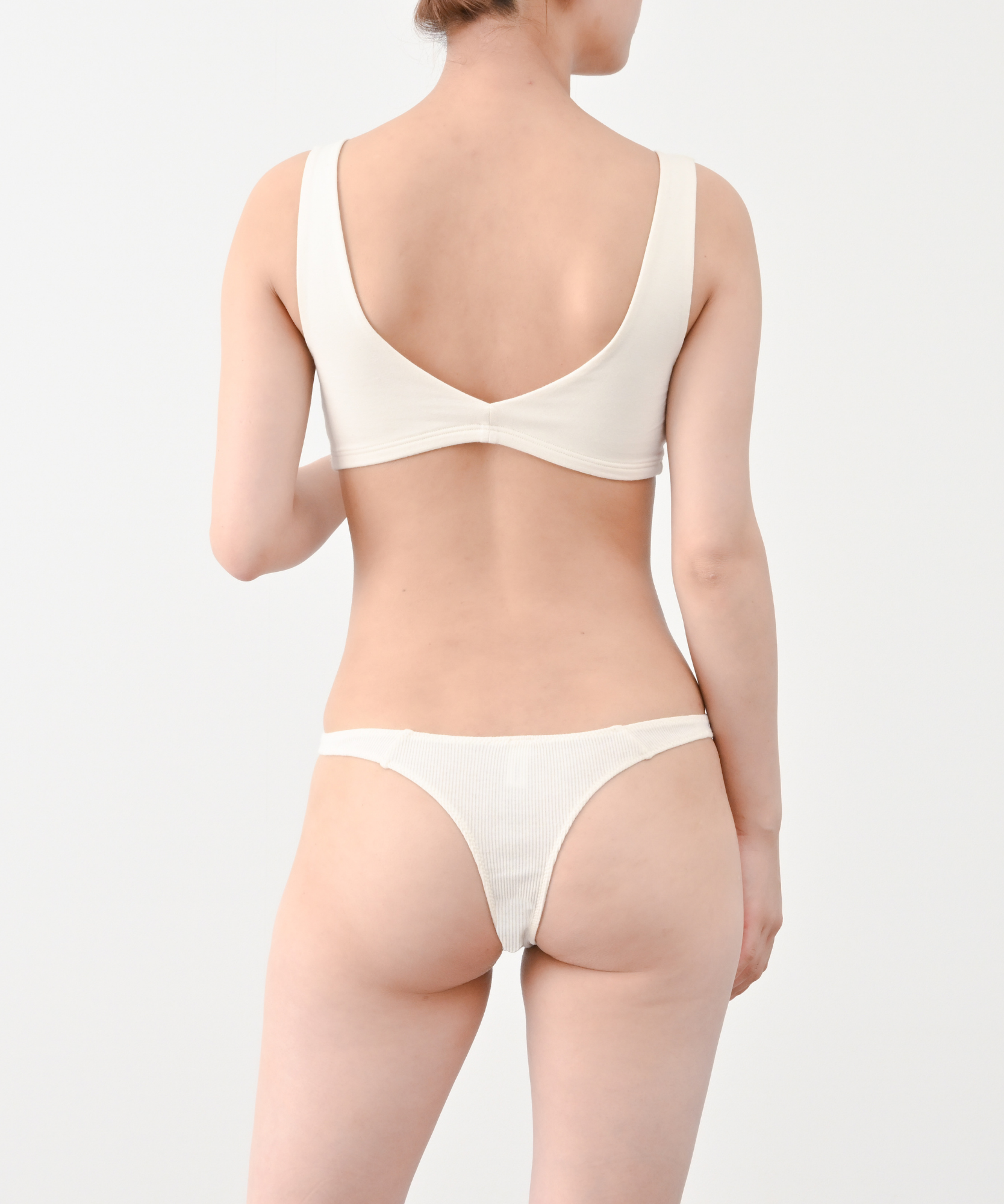 抜け感のあるフロントデザインと、下着っぽさを感じさせないヘルシーなバックスタイルがポイント。しっかりとしたホールド感を備えたオーガニックコットンリブトライアングルブラレット&足口は食い込みにくいハイレグカッティングで、ヘルシーなデザインのオーガニックコットンリブソングパンティ。