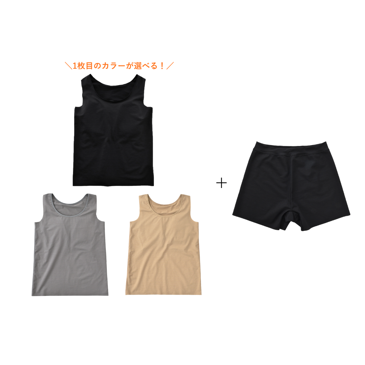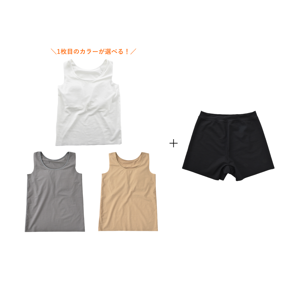 Nstyleのバストフラットインナー、タンクトップ3点(1枚目のカラーをお選びいただけます。)と、履いていることを忘れてしまいそうな心地よさ、リラックスショーツをセットにしました。