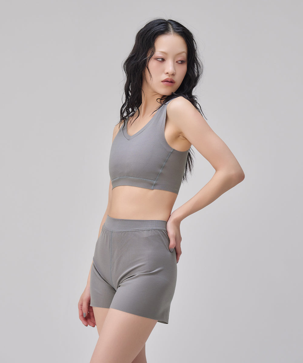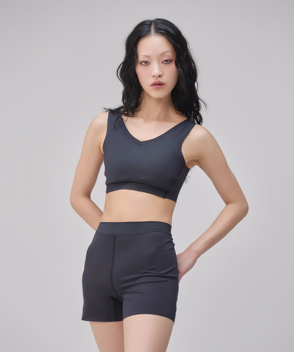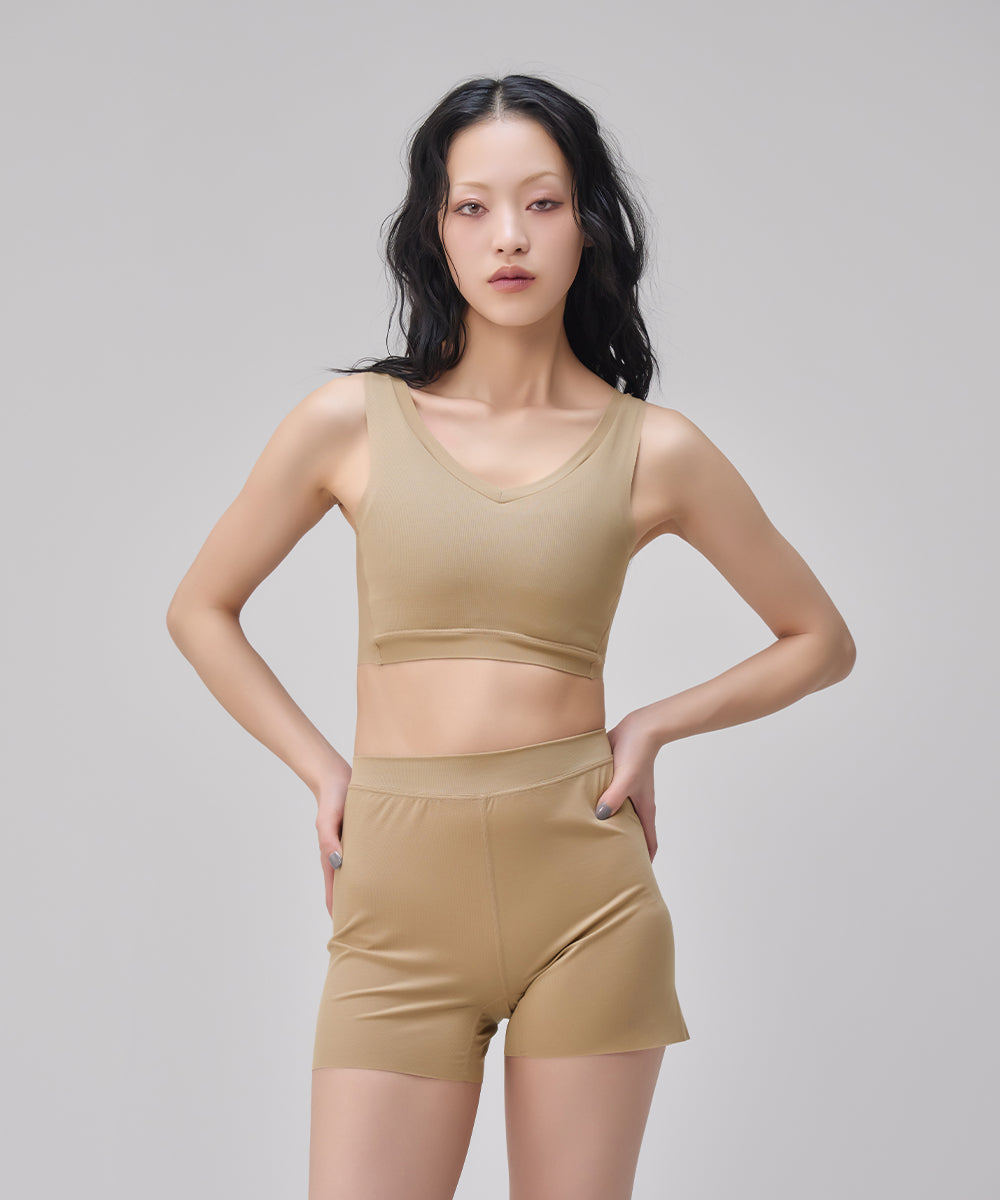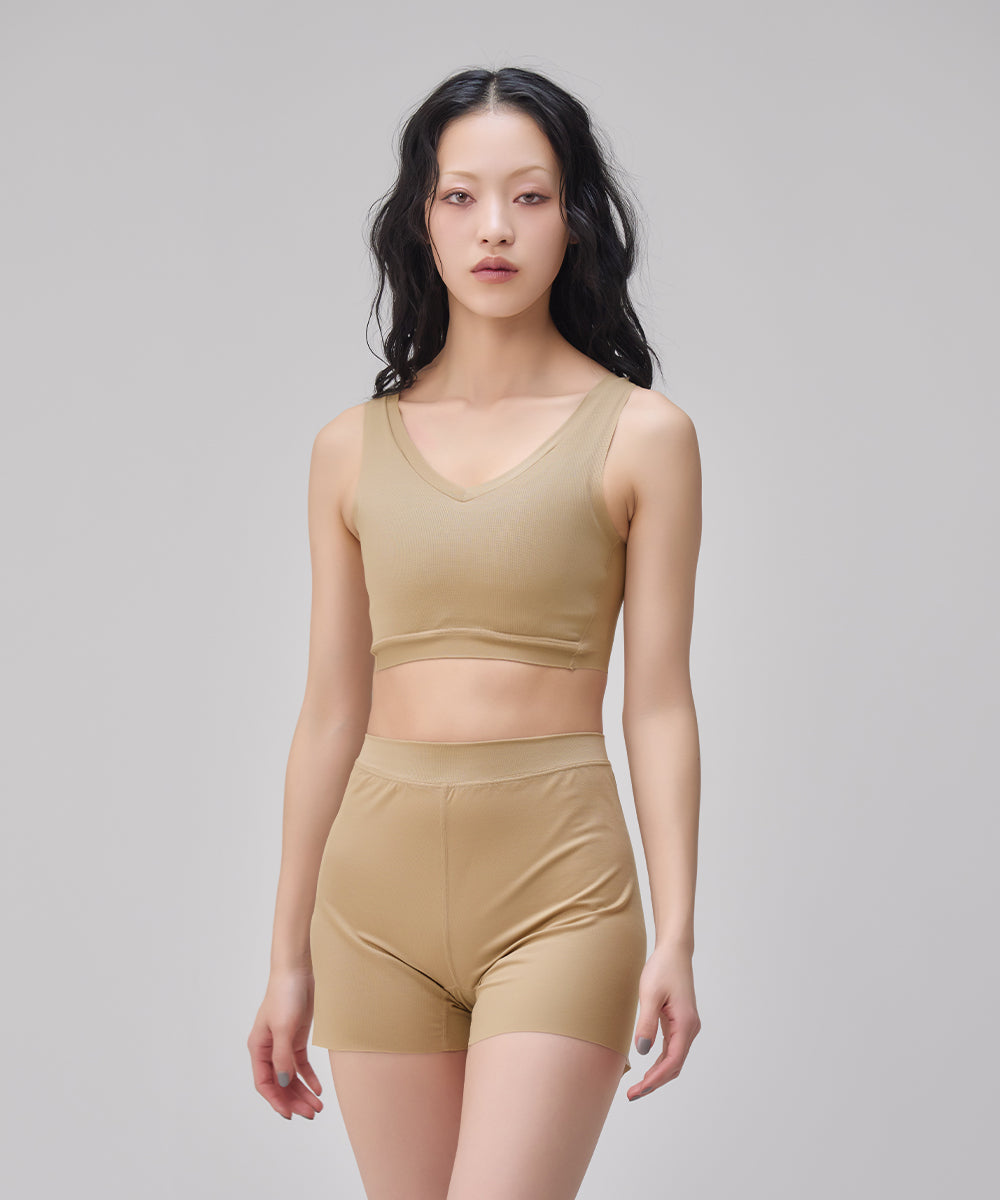 シャープなVネックがあらゆるファッションに合わせやすいNstyleのバストフラットインナー、Vネックハーフトップと、履いていることを忘れてしまいそうな心地よさのリラックスショーツをセットにしました。