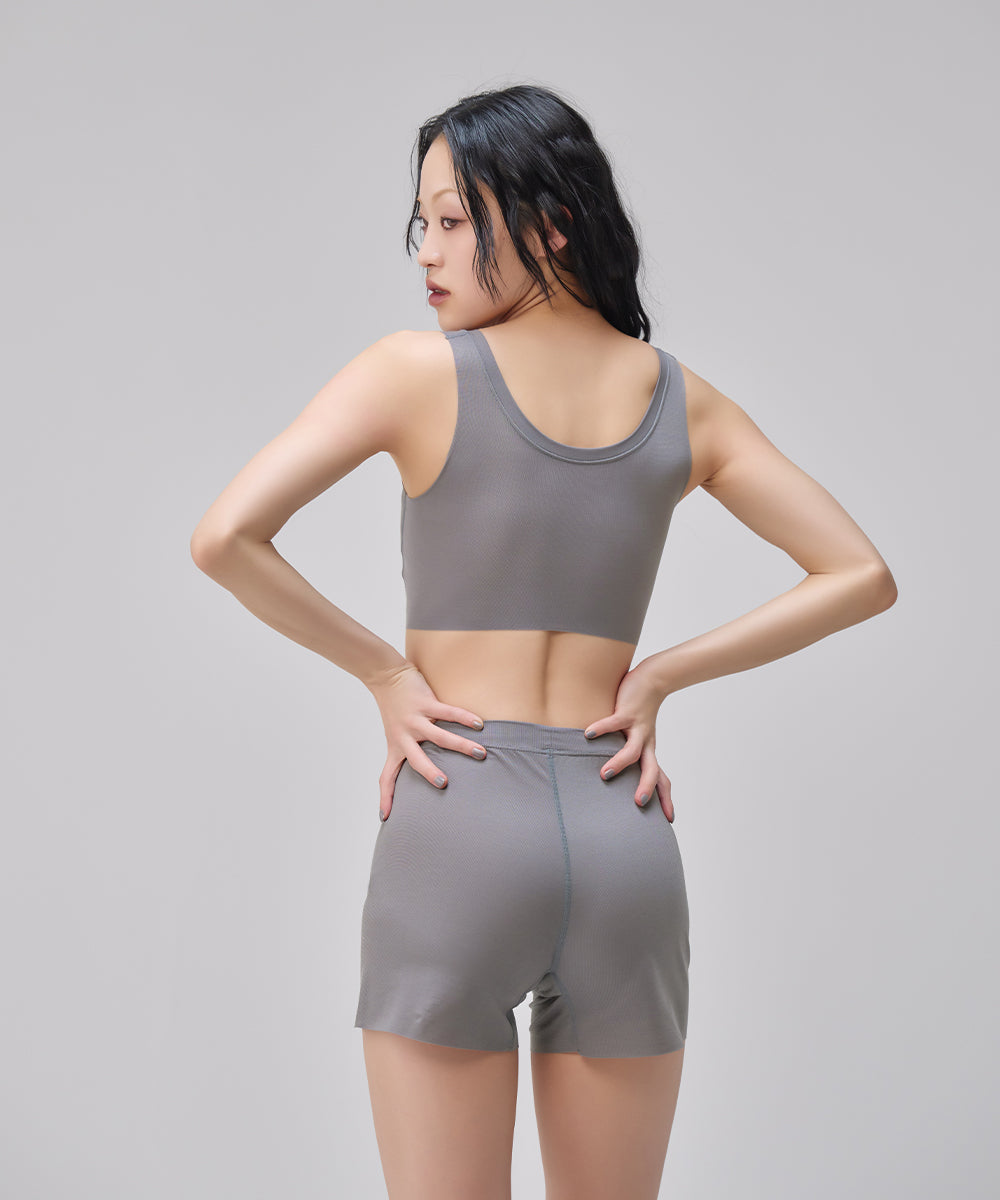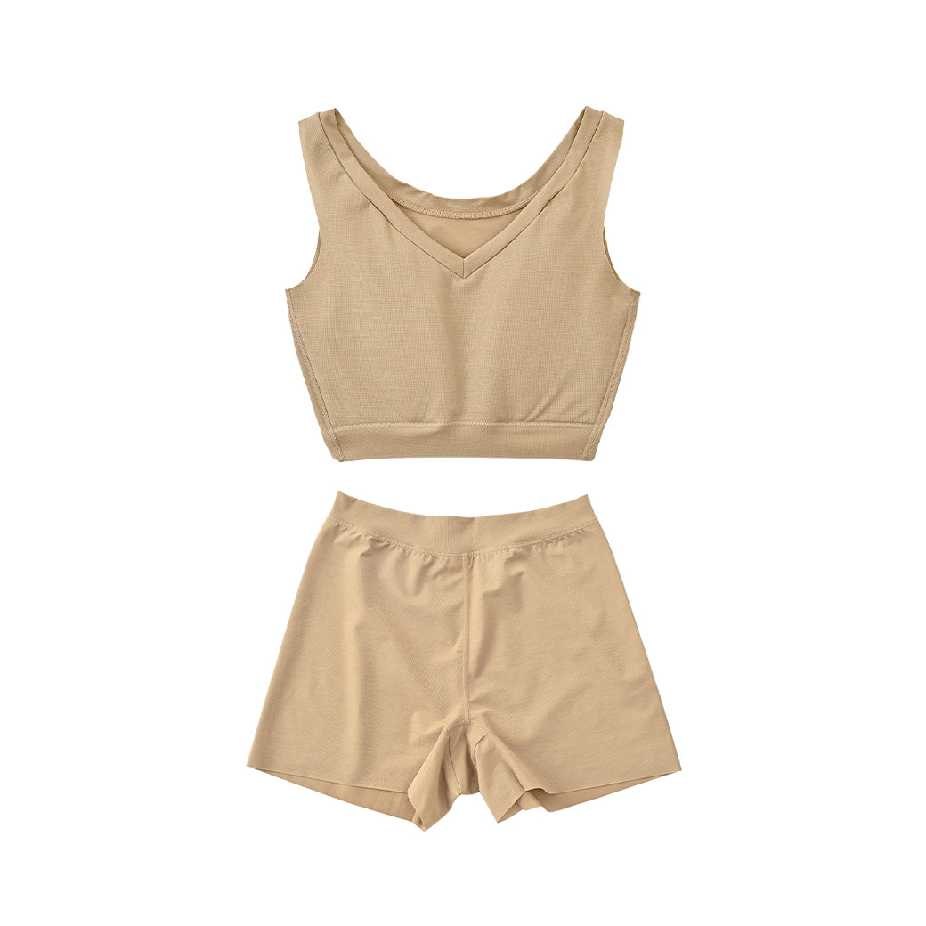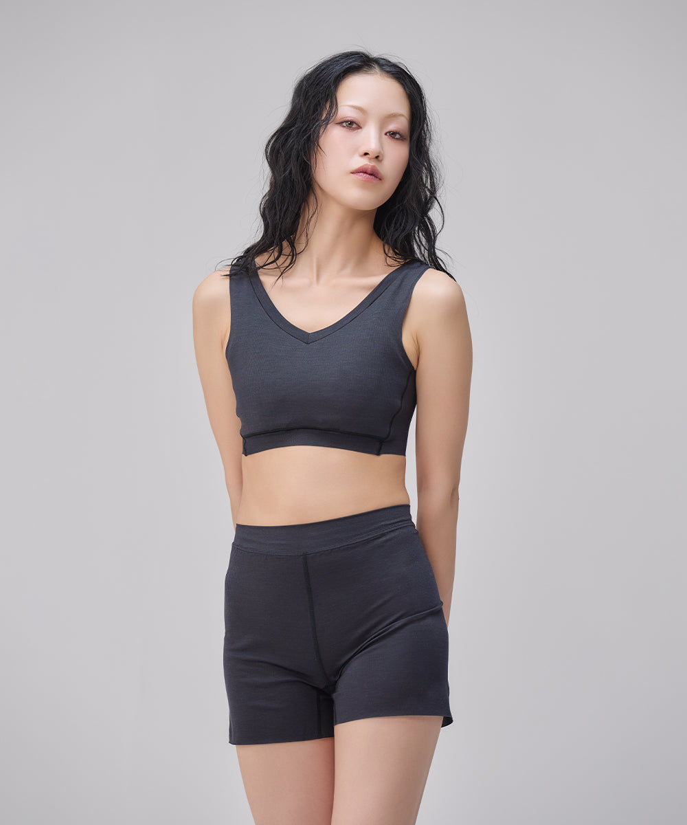 シャープなVネックがあらゆるファッションに合わせやすいNstyleのバストフラットインナー、Vネックハーフトップと、履いていることを忘れてしまいそうな心地よさのリラックスショーツをセットにしました。